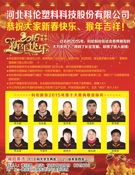 点击数:73752016-01-28 08:30:38 来源: 科伦塑业集团股份有限公司|农用薄膜|po膜|转光膜|EVA消雾膜|高效日光膜|棚膜|地膜|包装膜|土工膜|